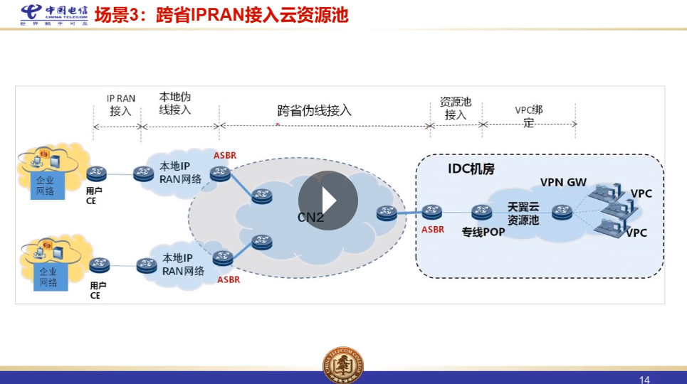 云专网就是先基于CN2网络搭建一张网,CN2是集团建设的一张基础承载网,云专网有一个点或多个点接入天翼云,然后客户通过PON或者IPRAN接入云专网,实现客户上云的需求;云专线和云专网的区别:云专线是客户以PON或IPRAN接入电信网络,将客户天翼云之间做一个二层专线连接,专线中间有些环节是逻辑通道连接;云专网也是客户以PON或IPRAN接入电信网络,将客户与已经搭建好的云专网做一个二层专线连接,然后进入云专网使用天翼云服务,也就是客户接入天翼云在本地网内是通过二层专线接入CN2的云专网,然后通过基于CN2的MPLS VPN三层网络接入天翼云。